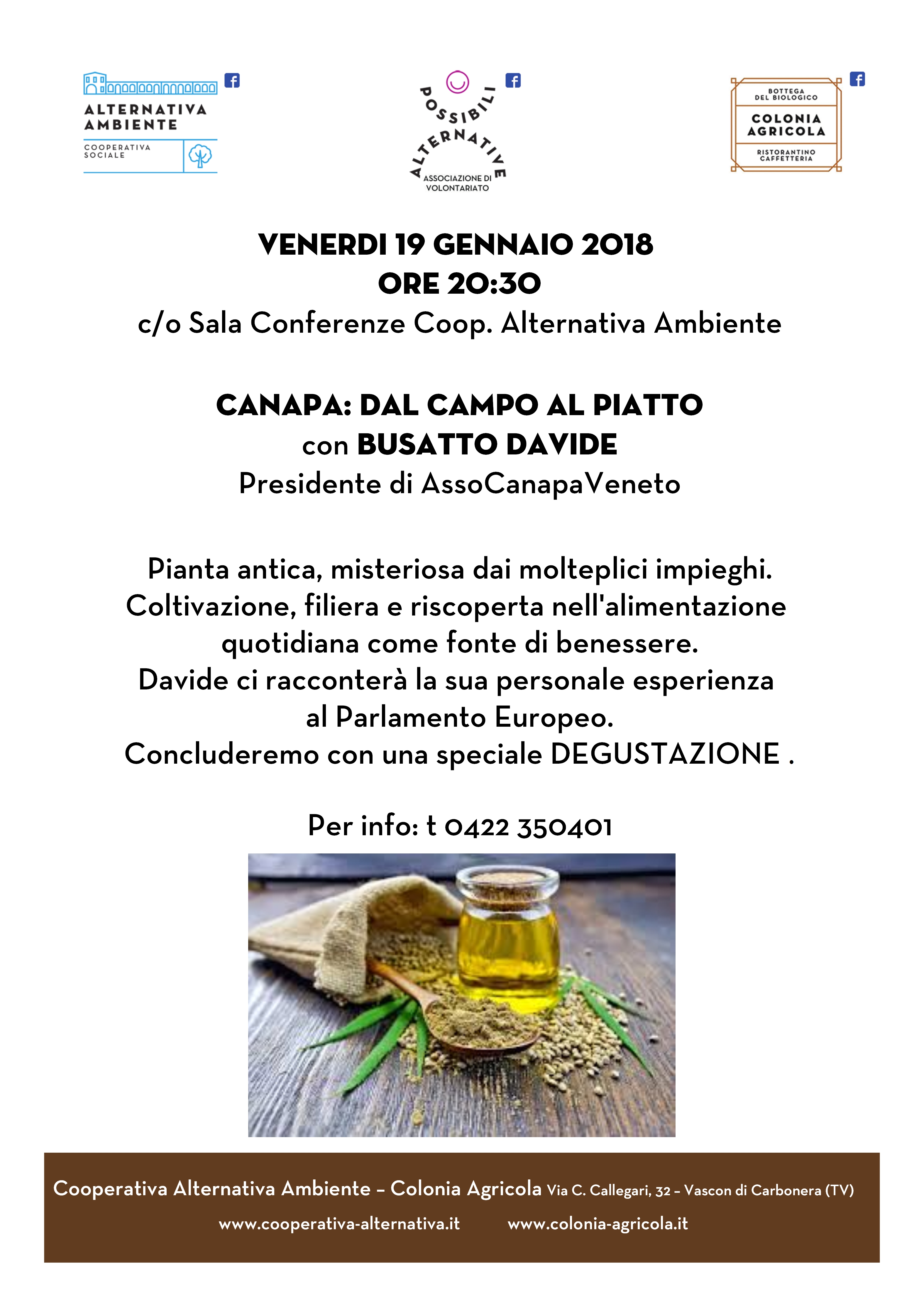 17 Gen Canapa: dal campo al piatto Posted at 15:54h in News, Promozioni by Matteo Cesare 0 Comments 0 Likes Share Tags: AssoCanapaVeneto, Canapa, Colonia Agricola, Davide Busatto